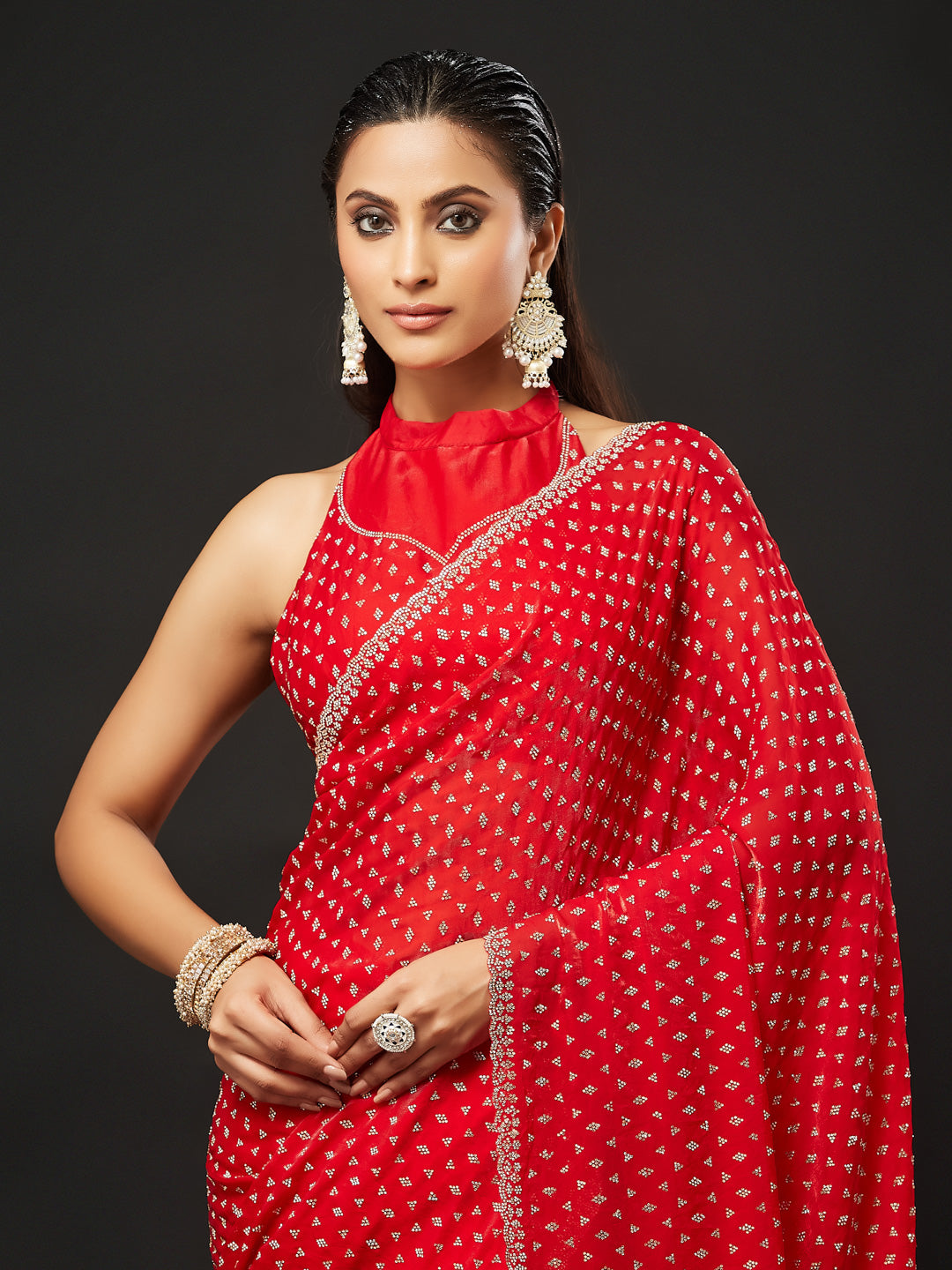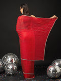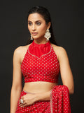 Step into effortless glamour with this Red Embellished Silk Blend Saree, a perfect statement piece for cocktail nights, festive parties, and reception celebrations. The saree features dense, all-over stone highlighting, giving it a radiant sparkle that stands out beautifully under lights.The rich red shade blends warmth and luxury, making the saree ideal for both day and evening events. Crafted in lightweight silk blend, the saree drapes smoothly with a graceful flow, while the pallu carries a mesmerizing shimmer that enhances every movement.Complementing the saree is a designer high-neck blouse, adding structure and a contemporary edge to the classic drape. This combination of modern blouse styling and traditional sparkle makes the outfit truly captivating