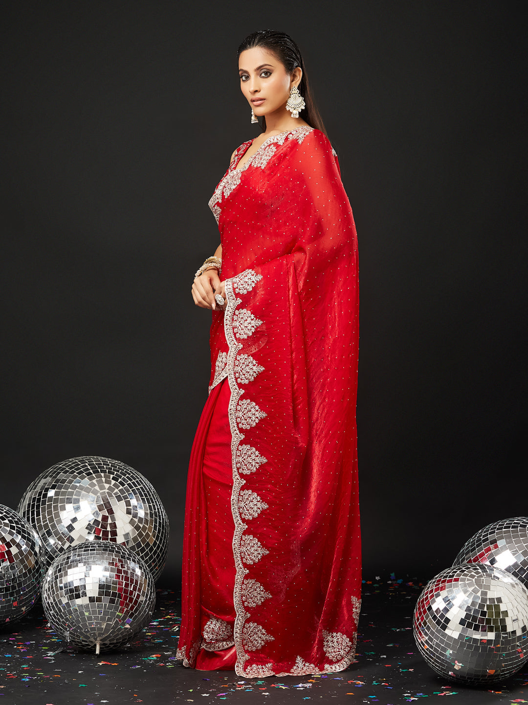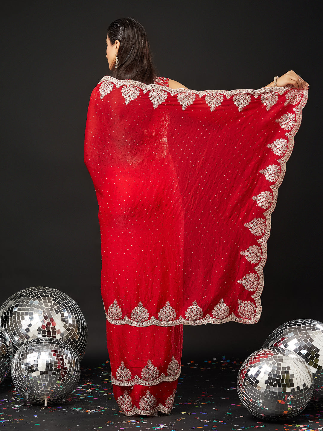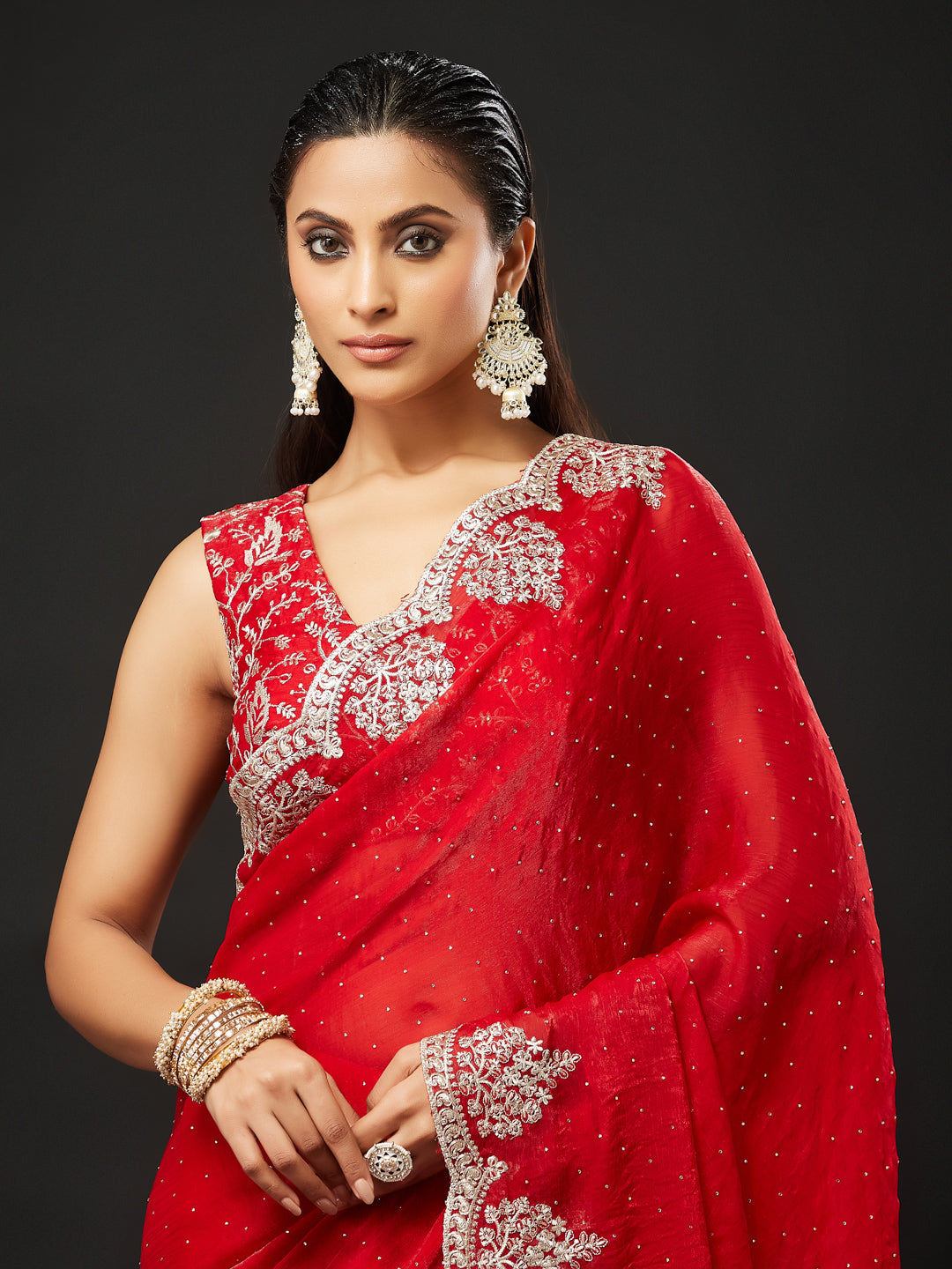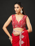 Make a commanding style statement with this luxurious red silk blend embellished saree, crafted for grand festive and wedding celebrations. The rich slik texture adds depth and opulence, while delicate stone and sequin handwork scattered across the drape create a soft yet glamorous shimmer.A beautifully ornate silver thread and stone-embroidered border enhances the traditional charm of the saree, giving it a regal touch. Paired with a matching embroidered blouse, this saree is perfect for bridesmaids, festive evenings, receptions, and high-glam events.