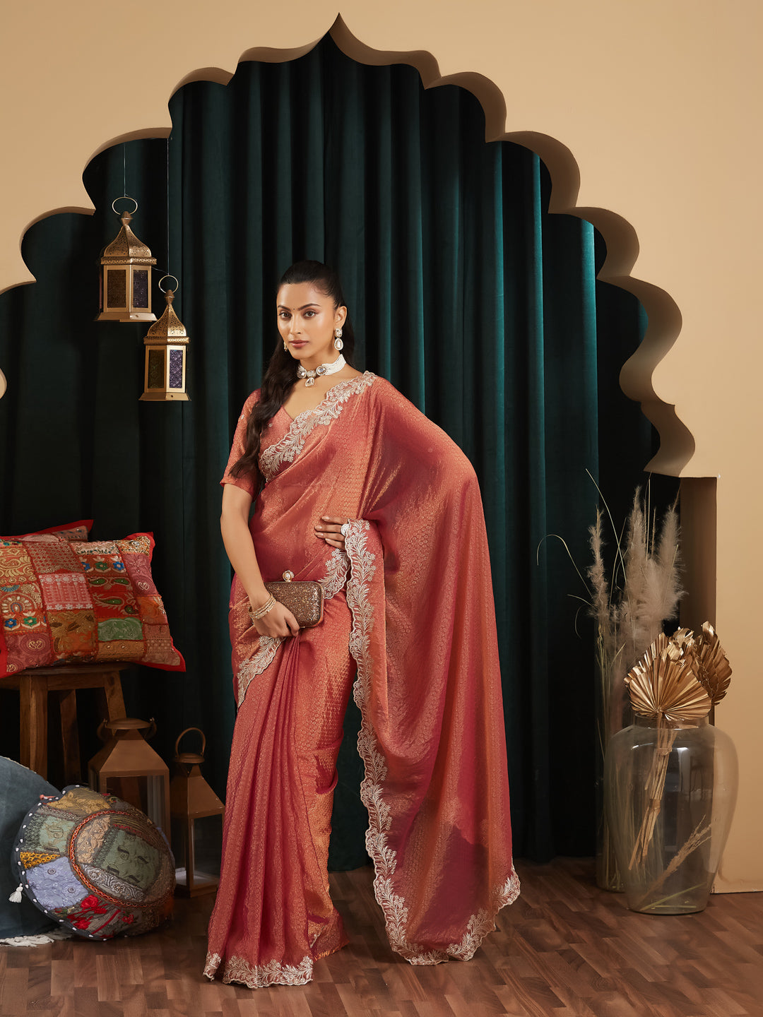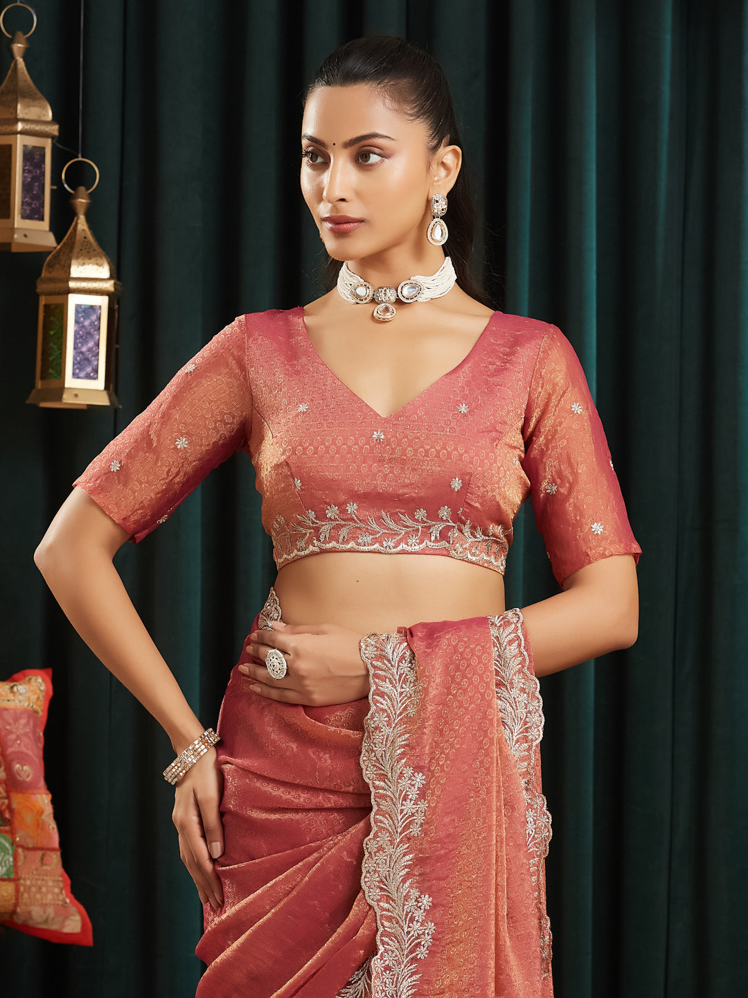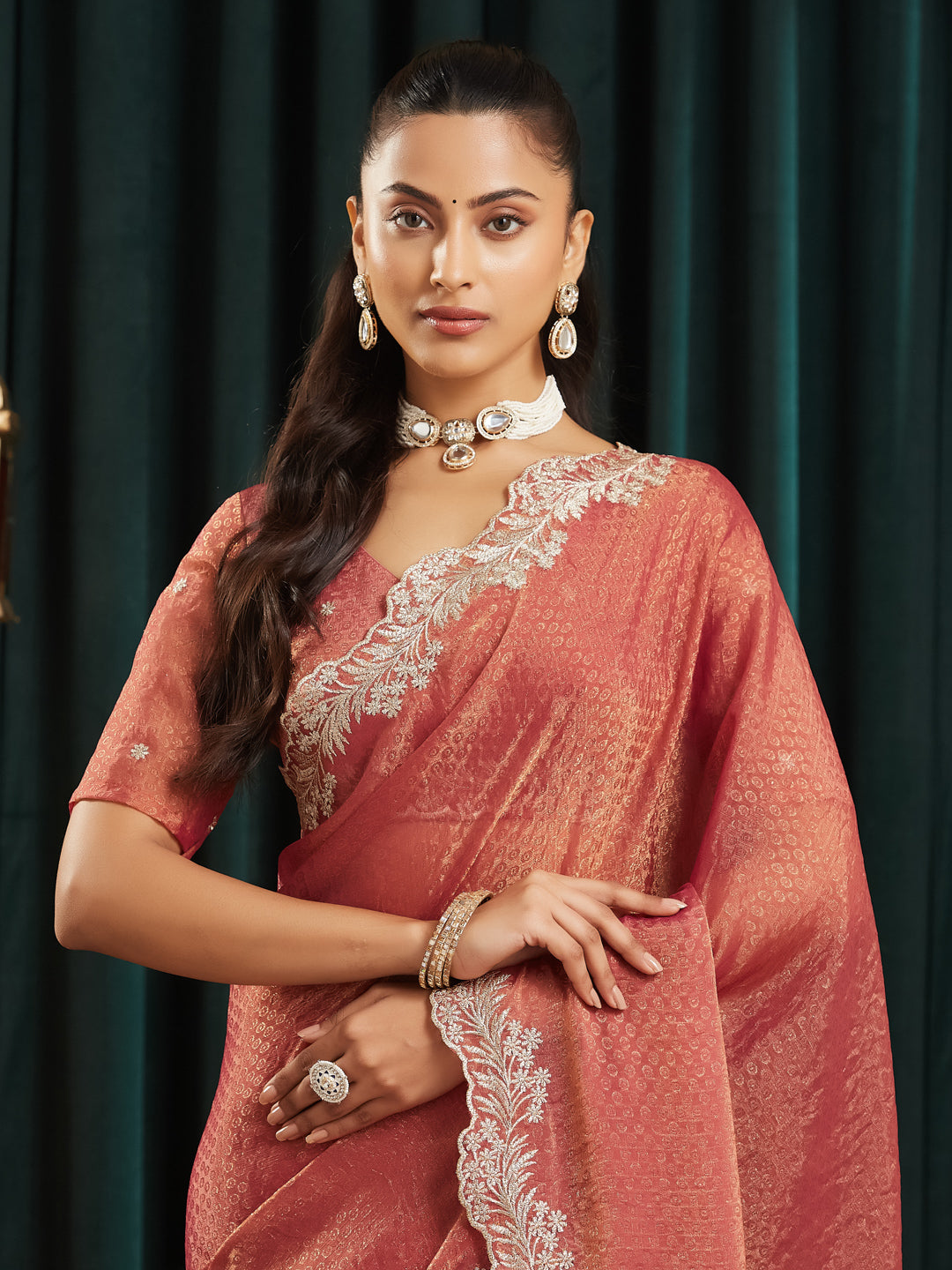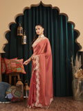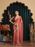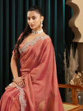 Elevate your festive wardrobe with this elegant rust saree, designed to bring effortless sophistication to every occasion. Crafted from lightweight silk blend, the saree features a subtle self-textured pattern across the body that adds depth and richness to the drape.A beautifully detailed embroidered border with intricate floral thread work enhances the saree, offering a refined and luxurious finish. The semi-sheer pallu adds a graceful touch, while the matching blouse piece completes the look. Perfect for weddings, festive gatherings, and evening celebrations, this saree blends traditional elegance with modern charm.