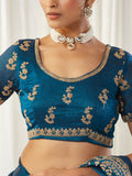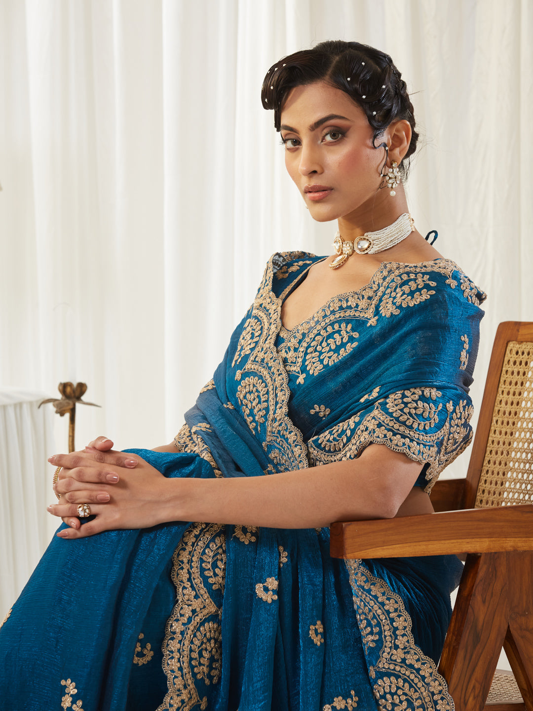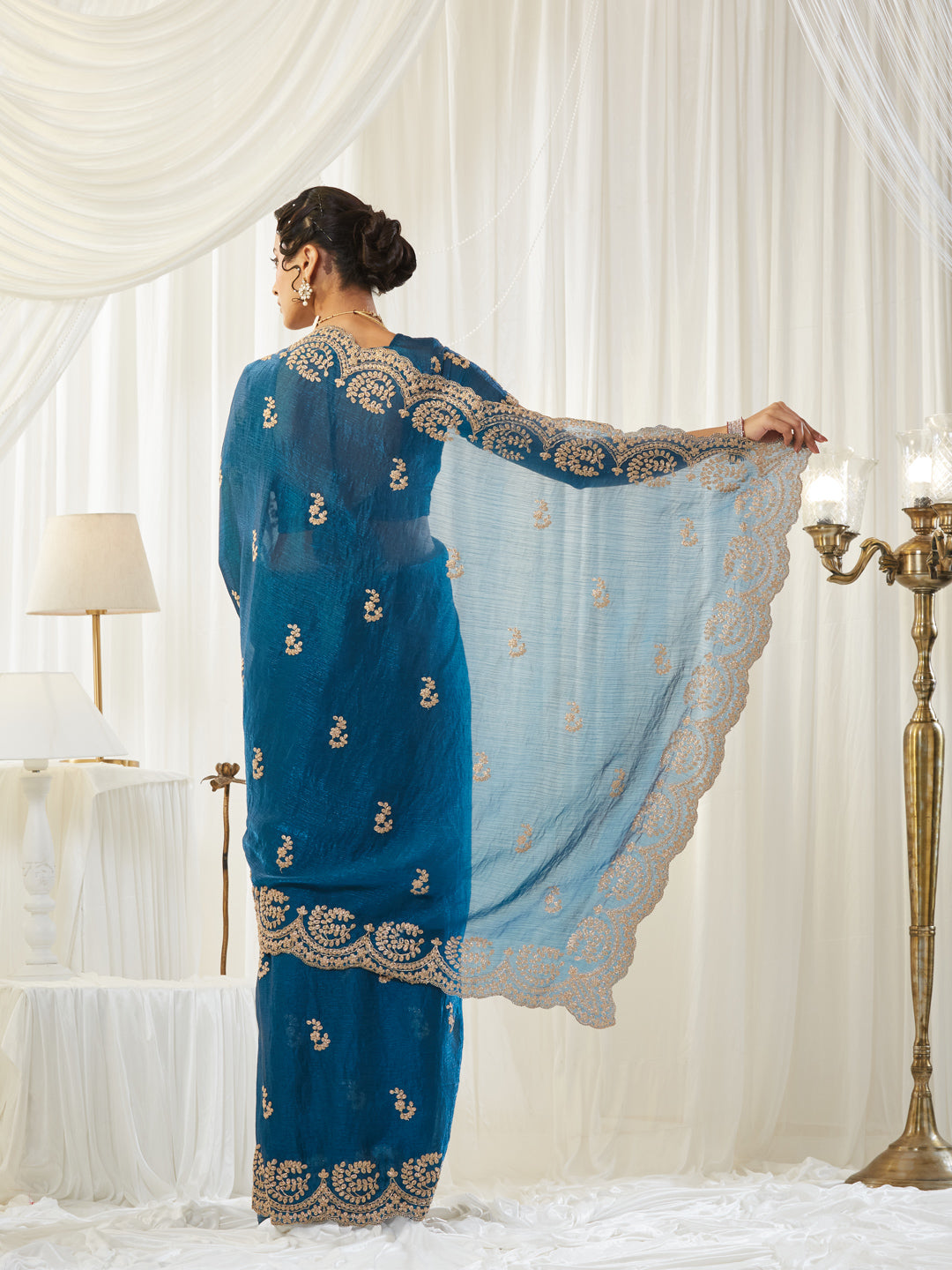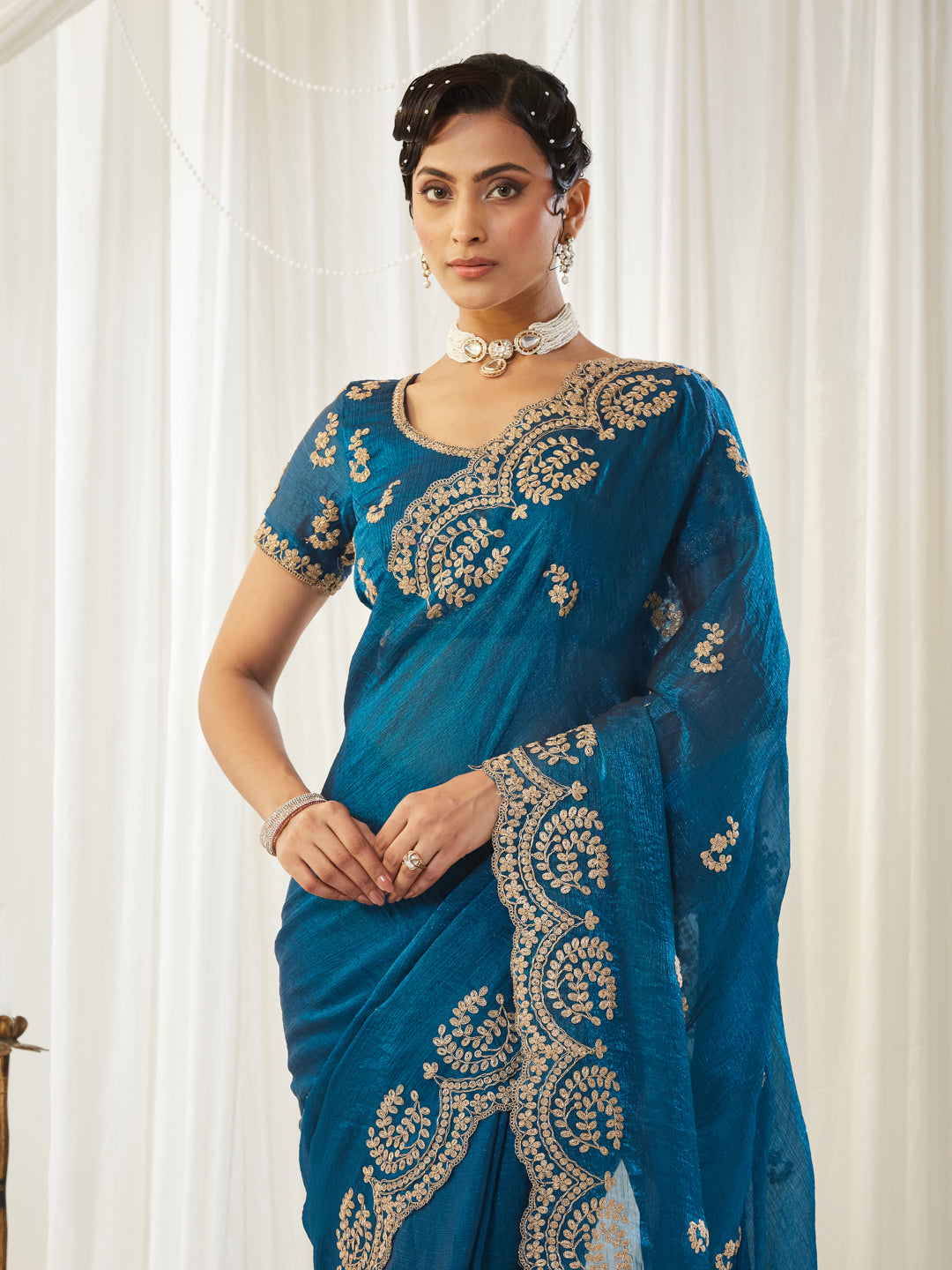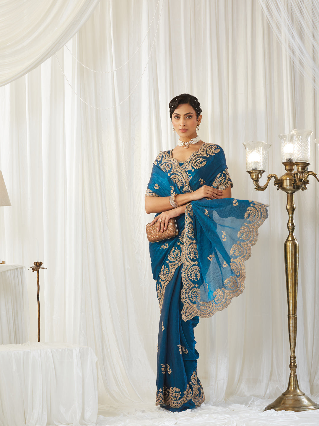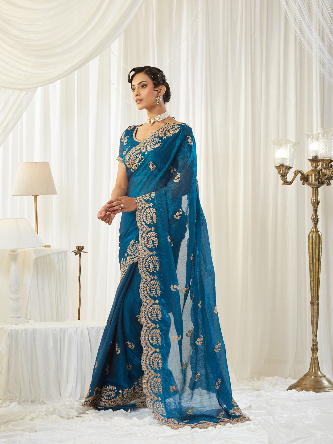 Make a statement of regal elegance with this Teal Blue Embroidered Silk Blend Saree, crafted for festive celebrations, weddings, and grand occasions. The saree features a sheer, lightweight silk base adorned with delicate golden buti embroidery scattered across the drape, adding subtle sparkle with every movement.The highlight of the saree is its intricately embroidered scalloped border, showcasing rich craftsmanship in golden threadwork. The border frames the saree beautifully, giving it a luxurious and ornate feel? perfect choice for traditional functions and evening festivities.The ensemble comes with a matching teal blouse, embellished with coordinated embroidery along the neckline and sleeves. The structured yet graceful silhouette of the blouse complements the airy drape of the saree, completing the look with finesse.