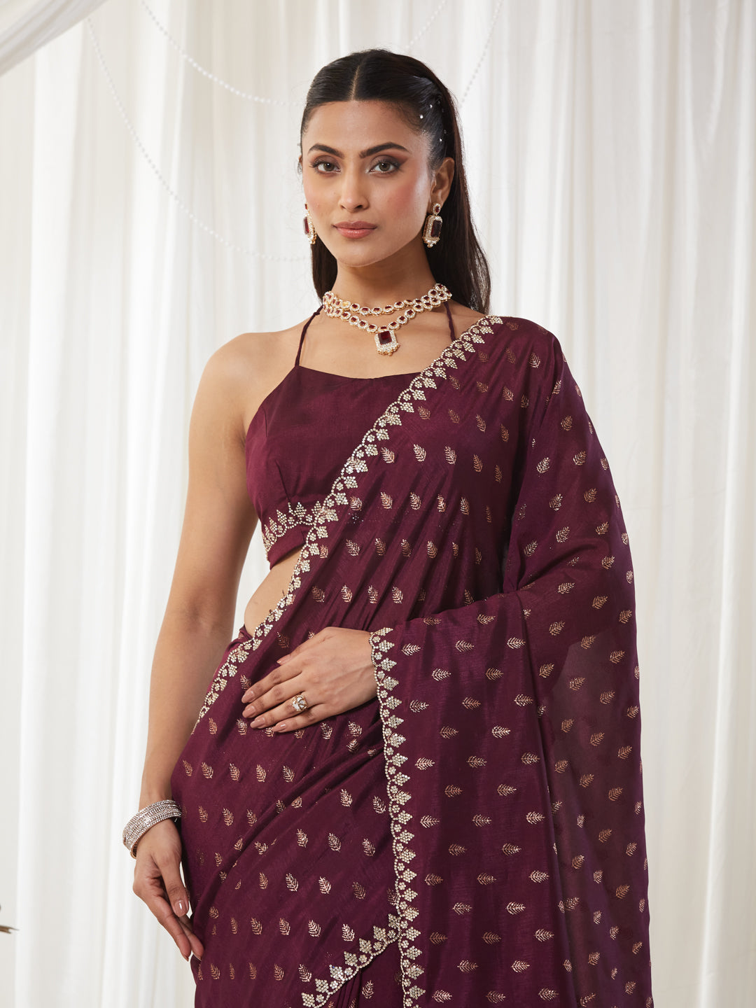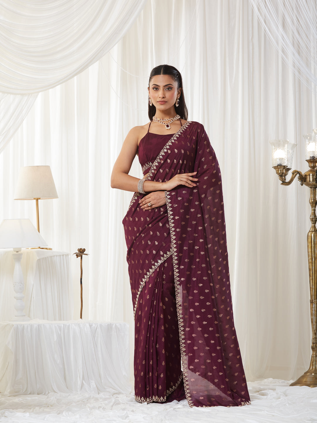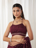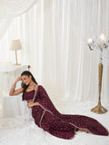 Elegance meets timeless charm with this Wine Zari-Embroidered silk cotton Saree, crafted to give your festive and evening wardrobe a regal upgrade. The saree features intricate gold-toned zari paisley motifs scattered uniformly across the body, adding a rich traditional touch while keeping the overall look sophisticated and refined.Made from lightweight silk blend, the saree drapes beautifully, offering a fluid silhouette that flatters effortlessly. The highlight of this piece is its delicately border, which frames the drape with ornate finesse, making it perfect for weddings, festive nights, receptions, or any special celebration.The pleated section maintains the same rich black hue, ensuring depth and consistency in the drape. The pallu carries the motifs in an airy, graceful flow, making it the perfect balance of tradition and contemporary style.Paired with a deep V-neck black blouse, this ensemble adds a bold, fashion-forward edge while maintaining its classic ethnic essence. The combination of shimmering zari and deep black makes this saree an undeniable showstopper.