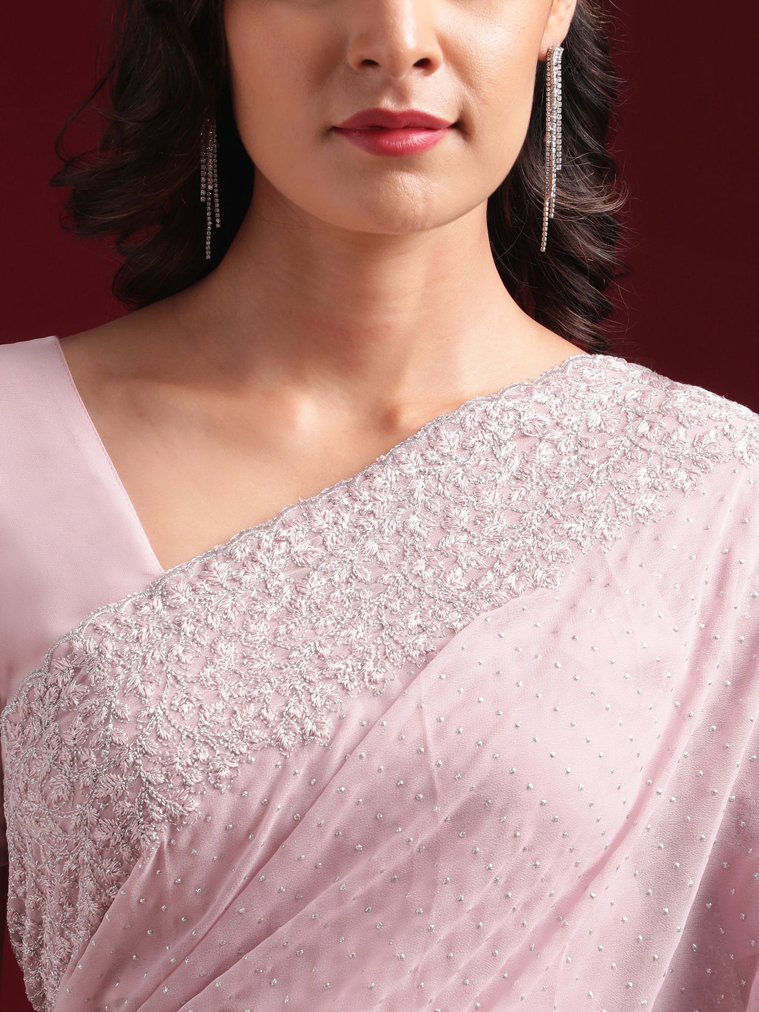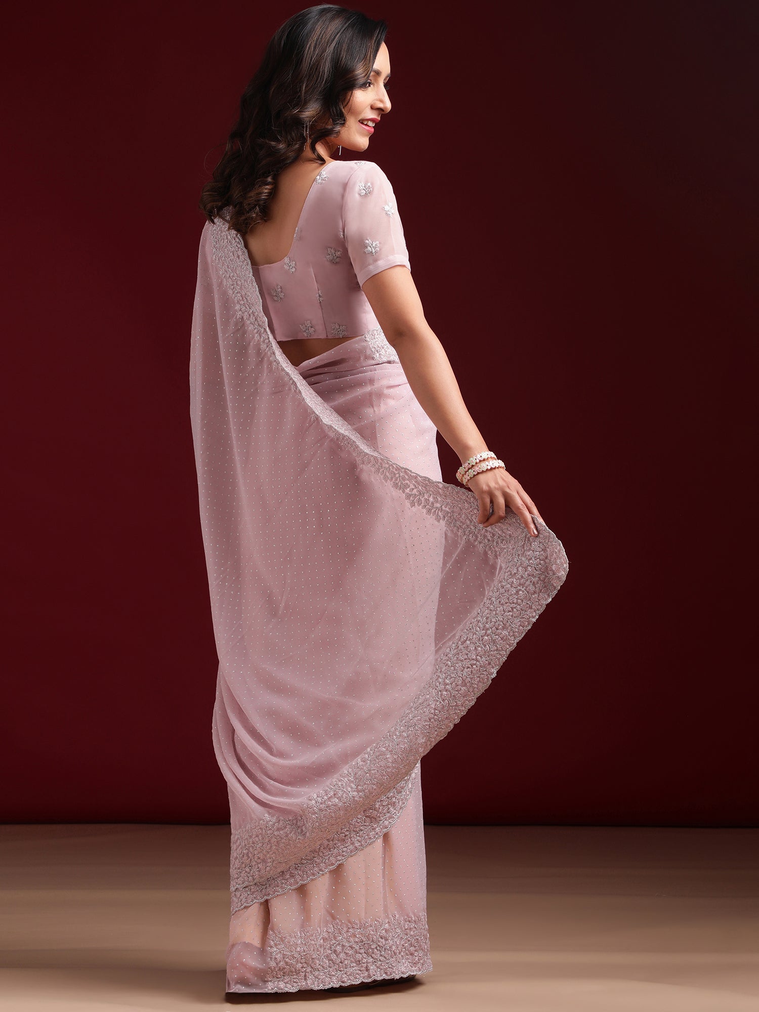 Elevate your evening ensemble with this ethereal lavender georgette saree adorned with fine embellishments. The delicate sequin embroidery work on the pallu and blouse area adds a soft sparkle, making this saree perfect for receptions, cocktail events, or engagement functions. Its lightweight georgette fabric ensures a graceful drape and ultimate comfort.