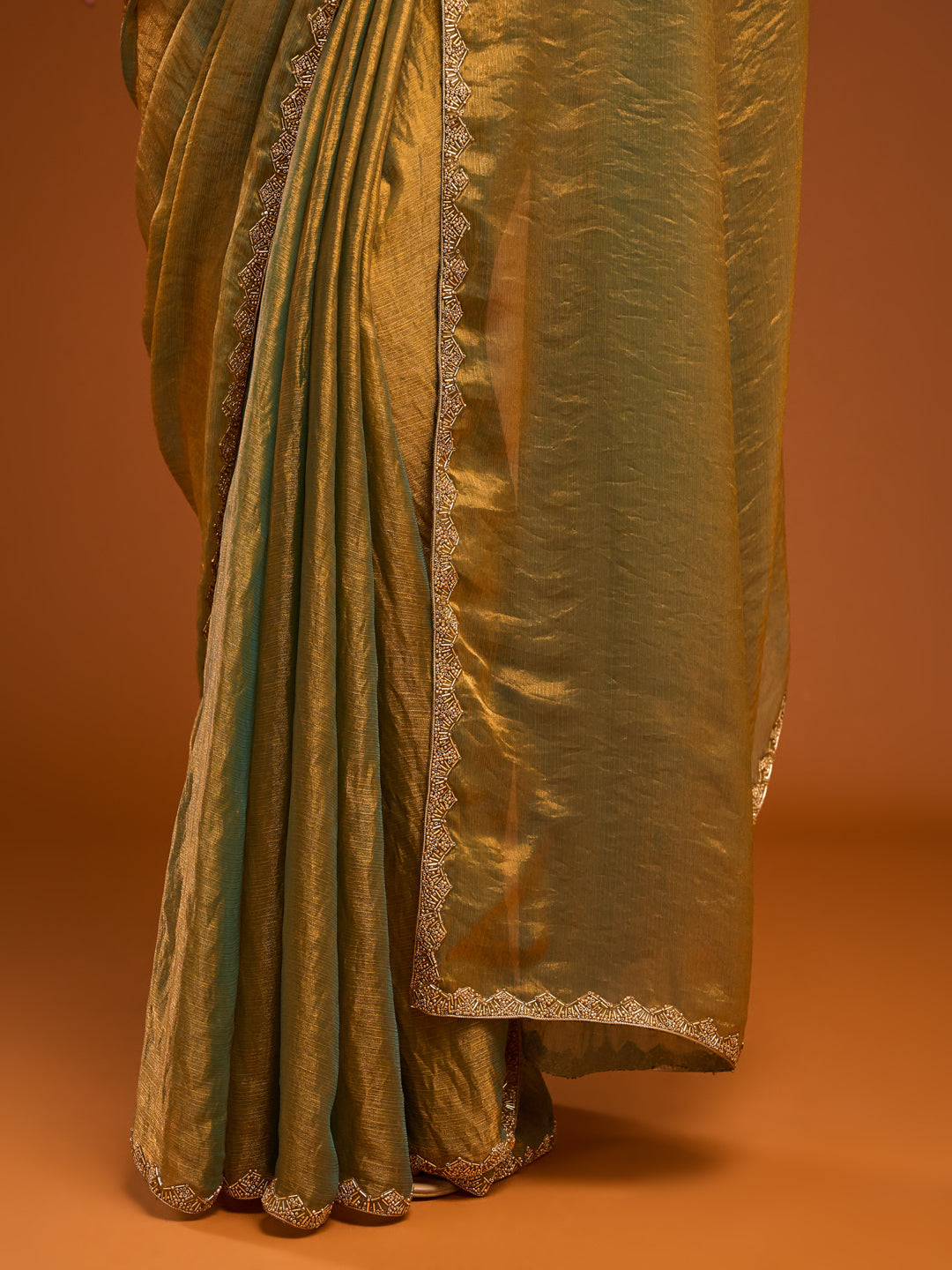 Drape yourself in timeless elegance with this antique mustard-gold crushed tissue silk saree that radiates warmth, grace, and tradition. The saree features a lustrous texture with a fine crushed finish and a delicate embroidered scalloped border that adds just the right hint of detail. Ideal for festive occasions, haldi ceremonies, or intimate gatherings.